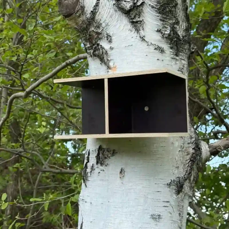 Budka lęgowa wykonana z odpornej na warunki atmosferyczne sklejki brzozowej.