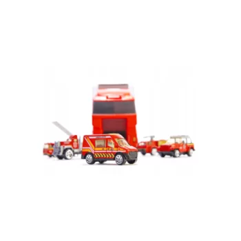 Zestaw składa się z ciężarówki, 6 aut służ specjalnych i lawety w kształcie walizki, którą wygodnie można transportować wraz z zawartością.