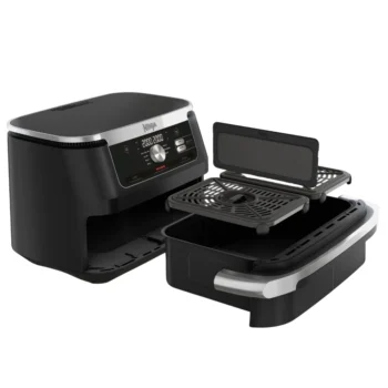 Wbudowane okienko w szufladzie pozwala kontrolować postęp pieczenia bez konieczności otwierania urządzenia, a automatyczne wyłączenie po wyjęciu kosza zwiększa bezpieczeństwo użytkowania.