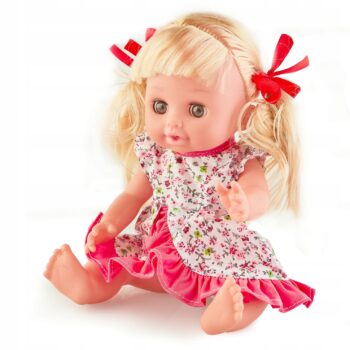 Lalka potrafi wypowiadać pojedyncze słowa przez naciśnięcie brzuszka. Ten zestaw zawiera otulacz dla lalki oraz akcesoria potrzebne do pielęgnacji i zabawy z niemowlakiem.