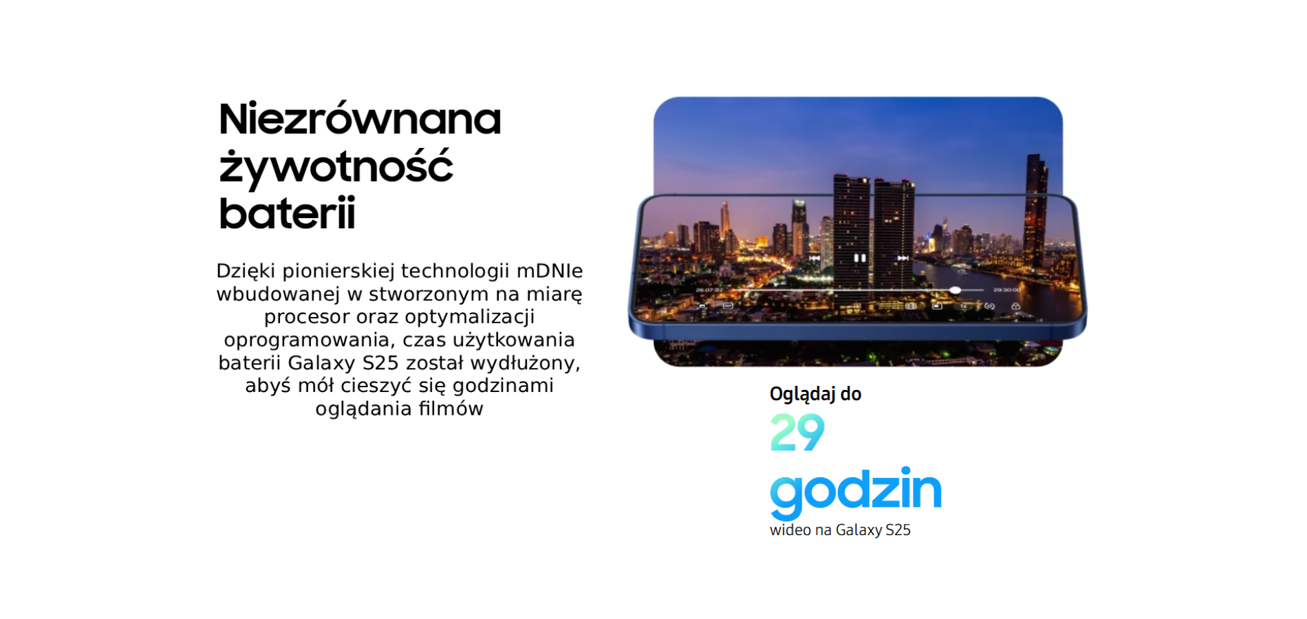 Samsung Galaxy S25 został wyposażony w najnowszy procesor Qualcomm Snapdragon 8 Elite for Galaxy, wykonany w nowoczesnym procesie technologicznym, zoptymalizowanym specjalnie dla smartfonów Samsunga. Ośmiordzeniowa jednostka oferuje znaczący wzrost wydajności CPU i GPU w porównaniu do poprzedniej generacji, zapewniając błyskawiczne uruchamianie aplikacji, płynną wielozadaniowość oraz wysoką stabilność pracy nawet przy dużym obciążeniu. Zintegrowany układ graficzny nowej generacji umożliwia komfortowe granie w najbardziej wymagające gry mobilne, obsługę grafiki 3D oraz zaawansowane funkcje multimedialne. Procesor wspierany jest przez 12 GB pamięci RAM, co przekłada się na szybkie przełączanie aplikacji i długotrwałą płynność systemu. Dodatkowo układ NPU odpowiada za obsługę funkcji Galaxy AI, wspierając inteligentne przetwarzanie obrazu, tekstu, tłumaczeń oraz optymalizację działania systemu w czasie rzeczywistym.