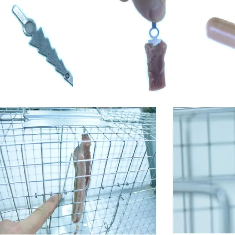 Taca została wyposażona w specjalne haczyki ułatwiające nakłucie mięsa w taki sposób aby zwierzak nie mógł zdjąć przynęty bez uaktywnienia mechanizmu zatrzaskowego. Zwierzak próbujący zabrać nakłóte mięso nie ma pojęcia o tym że porusza mechanizm, szarpiąc kawałek mięsa uaktywnia zapadkę zatrzaskując pułapkę. Haczyki można bez problemu schować w podłożu, w zestawie znajdują się aż dwa takie haczyki, aby nabić dwukrotnie przynętę.