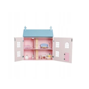 Drewniany piękny domek dla lalek, pudrowy róż z mebelkami otwierany